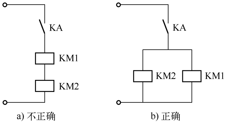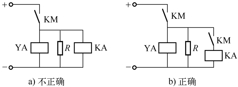 2)对于直流电磁线圈,当两电感量相差悬殊时不能直接并联,以免控制电路产生误动作,如图4-3a所示。直流电磁铁YA线圈与直流继电器KA线圈并联,当接触器KM常开触点断开时,KA很快释放。由于YA线圈的电感很大,存储的磁能经KA线圈释放,从而使KA有可能重新吸合,过一段时间KA又释放,这种情况显然是不允许的。因此应在KA的线圈电路中单独加一个KM的常开触点,如图4-3b所示。