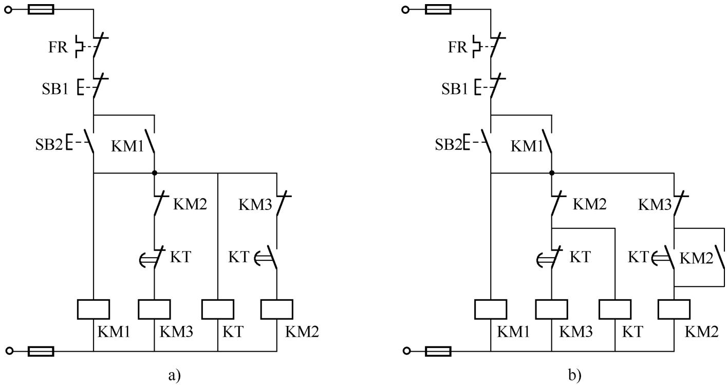 -△减压起动功能,但经过比较,图4-1b在正常工作时,只有接触器KM1和KM2的线圈得电,比图4-1a更合理。