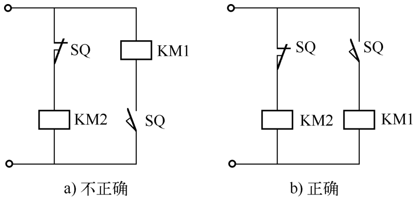 如果同一电气元件的常开触点和常闭触点靠得很近,当分别接在电源的不同相上时,如图4-4a所示的行程开关SQ的常开触点和常闭触点,常开触点接在电源的一相,常闭触点接在电源的另一相上,当触点断开时,可能在两触点间形成电弧造成电源短路。如果改成图4-4b的形式,由于两触点间的电位相同,就不会造成电源短路。所以在设计控制电路时,应使分布在电路不同位置的同一电器触点尽量接到同一电位点,可避免在电器触点上引起的短路。