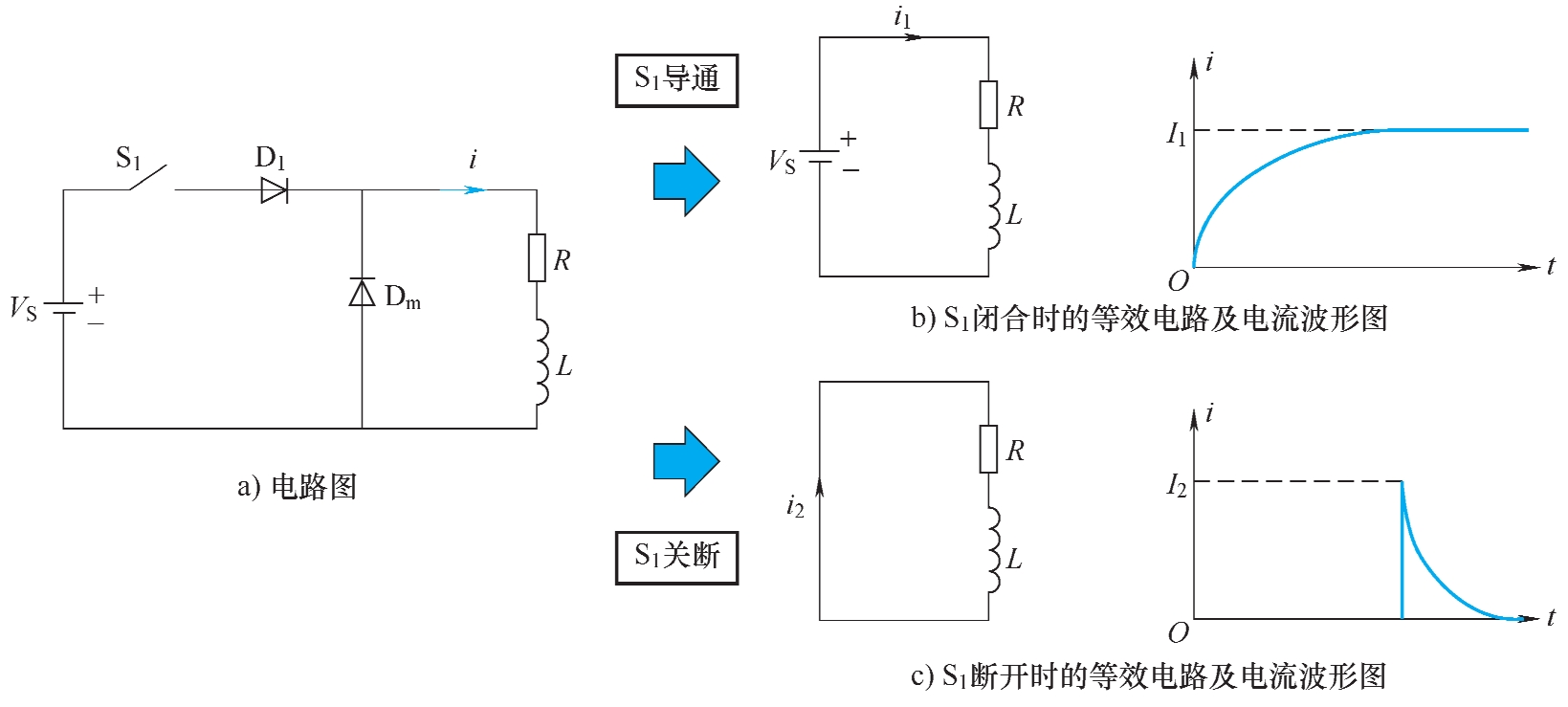 图2.10a显示了一个二极管续流电路。在该电路中,续流二极管D m 与 RL 负载并联连接。当S 1 闭合后,D 1 正向偏置,D m 反向偏置。此时电路可以等效为如图2.10b所示的电路,电路中的电流 i 从0A增加到最大值 V S /R 。其后,若S 1 断开,D 1 反向偏置,D m 正向偏置,此时电路可以等效为如图2.10c所示的电路。可见D m 为电感电流提供了续流通路,保证电感不开路运行。但由于没有外加电压源,电感中存储的能量经D m 续流后最终会全部消耗在电阻 R 上,此时电流降为0A。