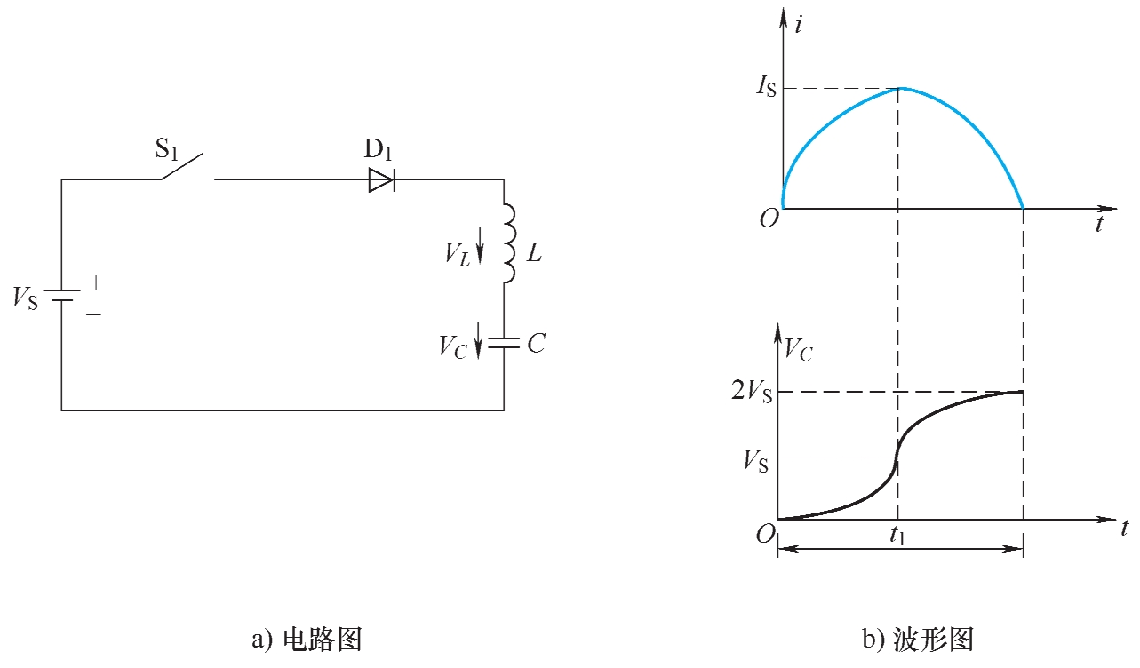 将图2.8a中的负载替换为电感和电容就得到图2.9a的感容负载电路。设电容 C 的初始电压为0V。在 t =0时刻,开关S 1 闭合,二极管D 1 正向偏置并导通,此时因为电感电流和电容电压均不能突变,所以 V L = V S , V C =0V。其后电感电流 i 和电容电压 V C 均上升。当 V C = V S 时, i 达到最大值,此时 V L =0V。此后,因 V C > V S ,电感承受反向电压,电路中的电流由最大值开始下降,但电容始终在被充电,所以电容电压继续上升。在该电路中,假设没有能量损失(理想二极管和理想开关),LC回路将谐振半个周波,使电容电压达到2 V S ,此时 i =0A,二极管D 1 截止。相应的电感电流和电容电压波形示意图如图2.9b所示。