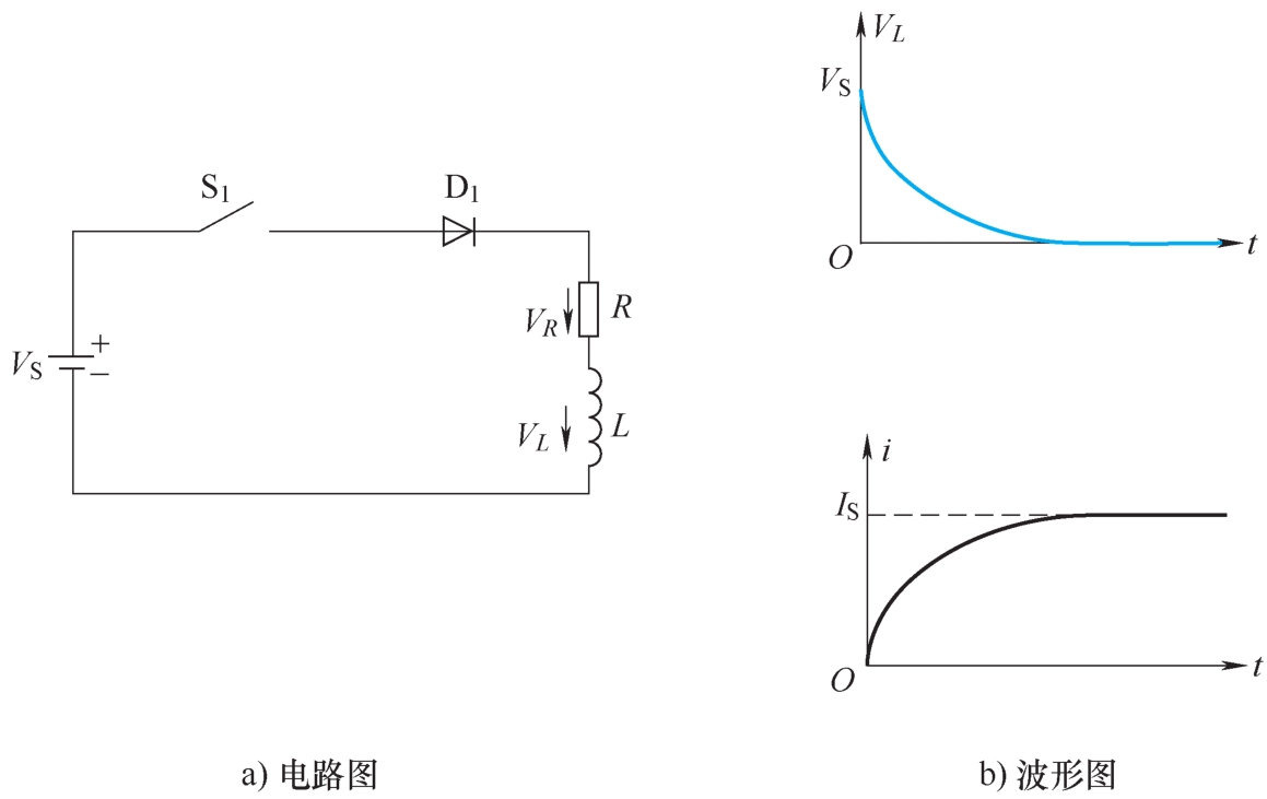 与图2.7a类似,图2.8a仅将负载由 RC 负载替换为 RL 负载。在S 1 闭合前, RL 负载没有电流流通, R 和 L 的端电压均为零。当 t =0时,开关S 1 闭合,二极管D 1 正向偏置并导通,基于基尔霍夫电压定律可得式(2.8)。由于电感电流不能突变,在 t =0时刻, i =0A, V R =0V, V L = V S 。