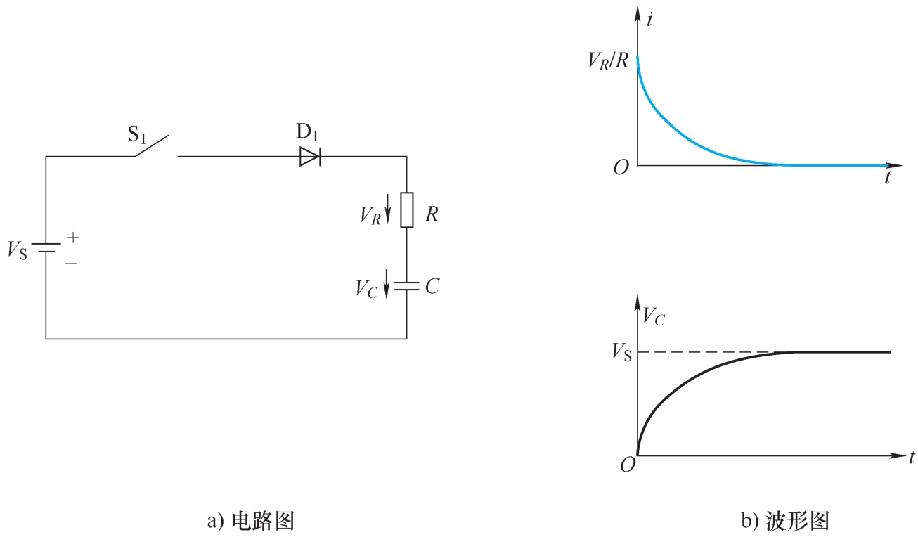 因为电容电压不能突变,在 t =0时,电容电压为0V,其后电容被充电, V C 随时间增加,如式(2.7)所示。此外,电路电流由初始时刻的最大值逐渐下降,当 V C = V S 时, i =0A,此时,二极管截止。 V C 和 i 的波形如图2.7b所示。