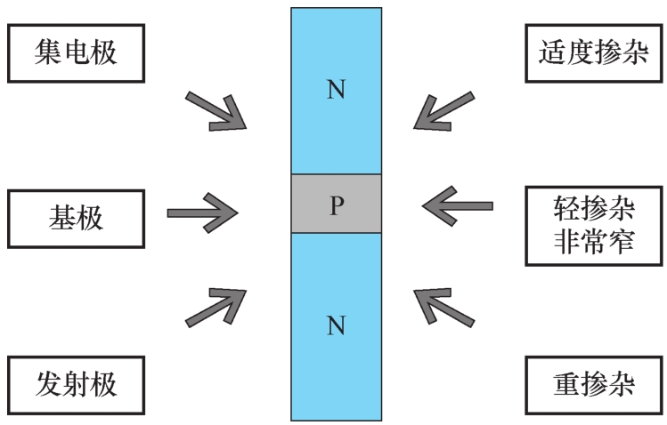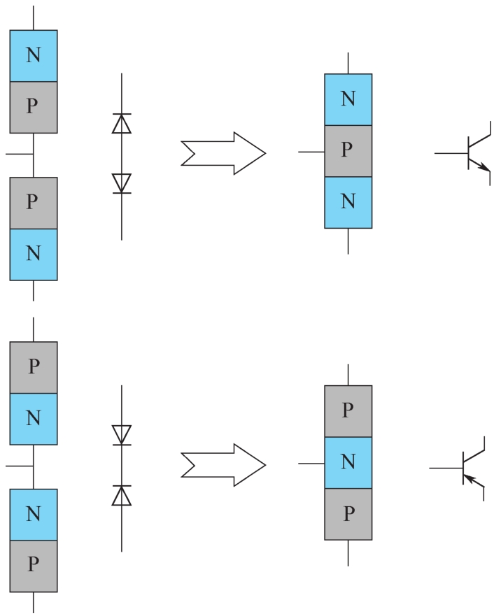 BJT由三层半导体构成,分为NPN型和PNP型两种类型。这两类BJT都具有两个PN结,且两个PN结是反向串联结构,如图2.11所示。通常两个反向串联的PN结是无法作为开关使用并导通电流的。因此,在BJT的实际构造过程中需要对三层半导体做特殊处理,简述如下。