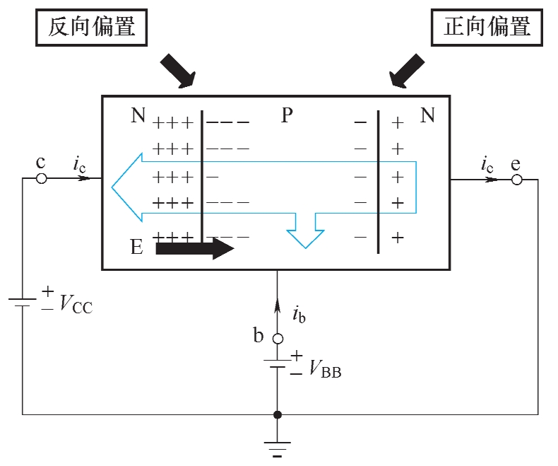 图2.13 NPN型BJT导通时载流子扩散和流通示意图