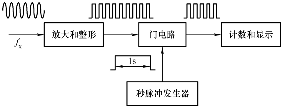 图1.1.3为一个数字频率计的电路框图,它是用来测量周期信号频率的。假定被测信号是频率为 f x 的正弦波,为了要把被测信号的频率用数字直接显示出来,首先要将被测的模拟信号放大、整形,使被测信号变换成同频率的矩形脉冲信号。既然是测量频率,则还需要有个时间标准,以秒(s)为单位,把1s内通过的脉冲个数记录下来,就得出了被测信号的频率。这个时间标准由脉冲发生器产生,它是宽度为1s的矩形脉冲。由秒脉冲来控制门电路,又由门电路来控制电路的开通与关断。这样秒脉冲把门电路打开1s,在这1s内,整形后的矩形脉冲通过门电路进入计数器,计数器累计的信号个数就是被测信号在1s内重复的次数,即信号的频率。最后通过显示器显示出来。