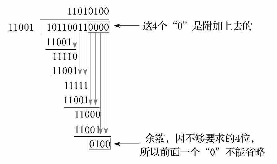 步骤02 因为生成多项式的位数为5,根据前面的介绍得知CRC码的位数为4(校验码的位数比生成多项式的位数少1位)。因为原数据帧为10110011,在它后面再加4个0,得到101100110000,然后把这个数以“模2除法”的方式除以生成多项式,得到的余数(即CRC码)为0100,如图1-8所示。