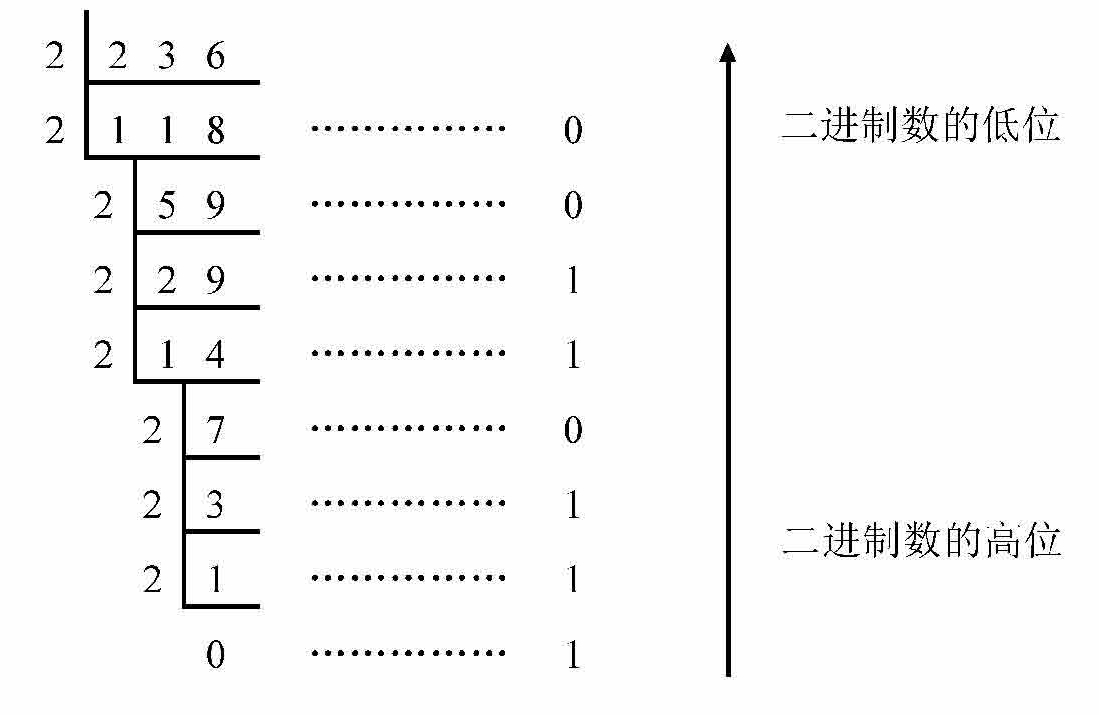 将已知的十进制数的整数部分反复除以 n ( n 为进制数,取值为2、8、16,分别表示二进制、八进制和十六进制),直到商是0为止,并将每次相除之后所得到的余数按次序记下来,第一次相除所得余数 K 0 为 n 进制数的最低位,最后一次相除所得余数 K n -1 为 n 进制数的最高位。排列次序为 K n -1 K n -2 … K 1 K 0 的数就是换算后得到的 n 进制数。