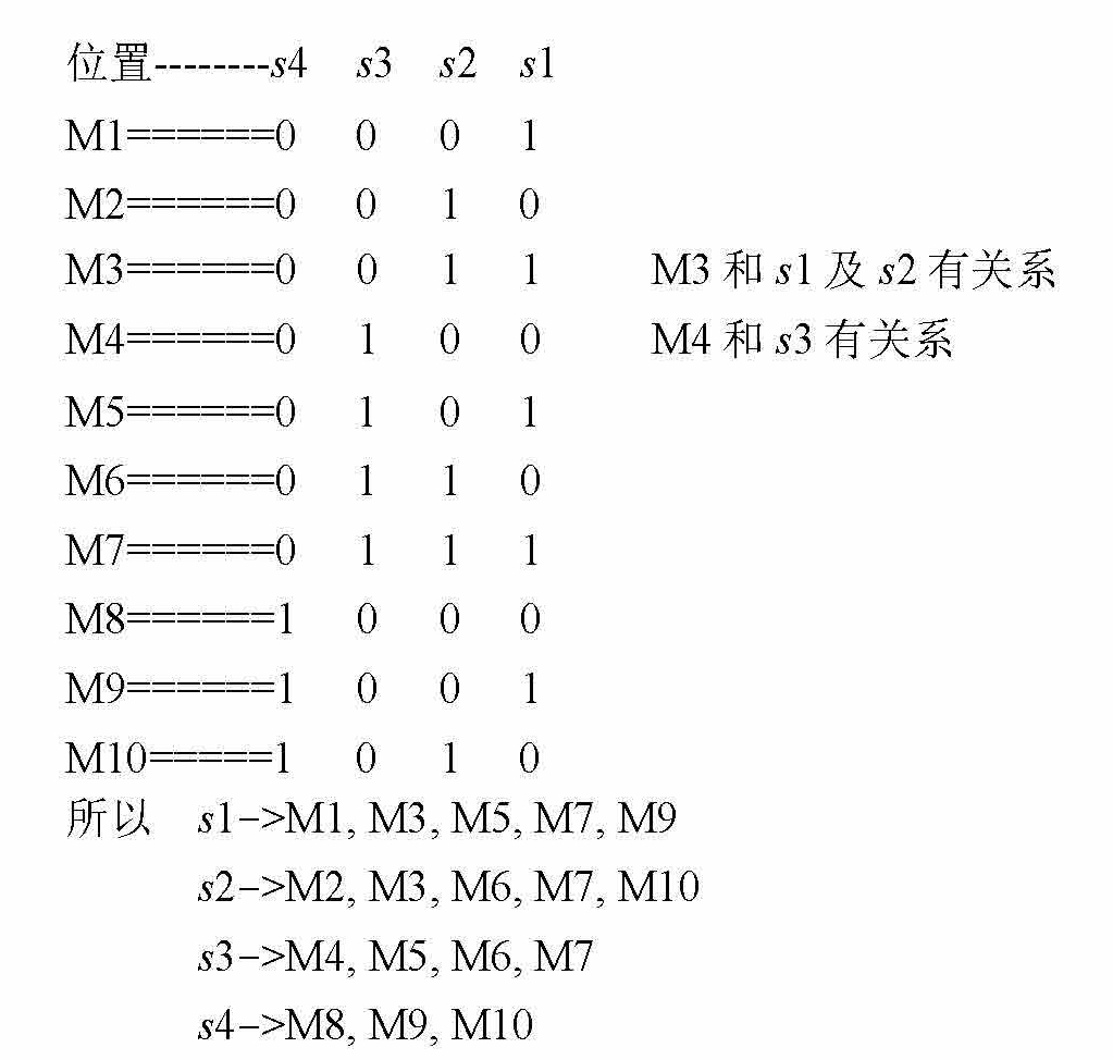 M1位置十进制是1,转成4位二进制数就是0001,即M1和 s 1有关系。同理,M2位置十进制是2,转成4位二进制数就是0010,对应 s 4 s 3 s 2 s 1。 s 2的位置上是1,所以M2和 s 2有关系。