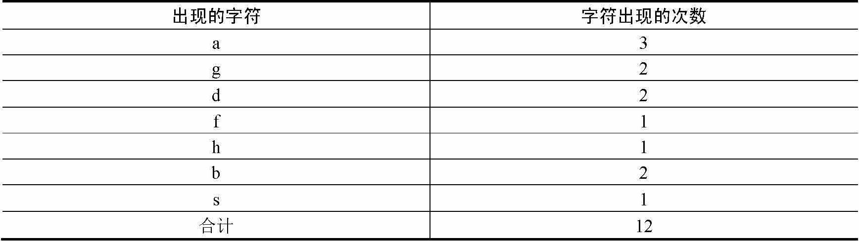 如表1-5所示,统计每个字符出现的次数。如图1-7所示为字符串agdfaghdabsb的哈夫曼编码的哈夫曼树。
