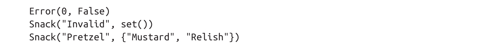 Snack中包含一个名称、可以放在上面的调味品列表、指示错误的错误代码,以及一个跟踪该项目是否被正确处理的布尔值。这个字典可以有多少种不同的值组合?无穷无尽,对吧?名称(name)可以是任何字符串,从有效值(“hotdog”或“pretzel”)到无效值(“samosa”“kimchi”或“poutine”)或者毫无意义的(“12345”“”或“(╯°□°)╯(┻━┻”)。调味品也一样。就目前而言,没有办法穷尽它们的所有情况。