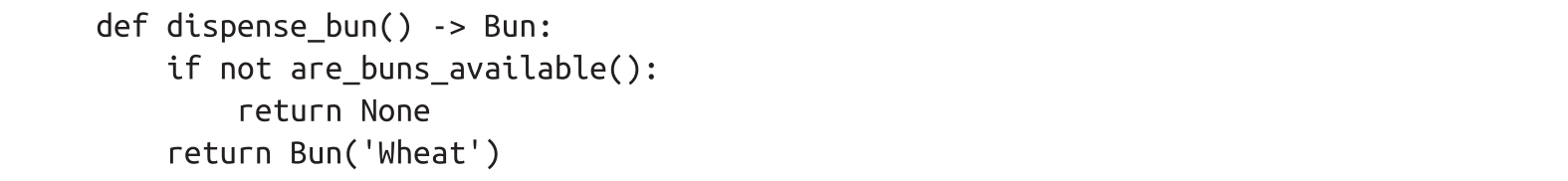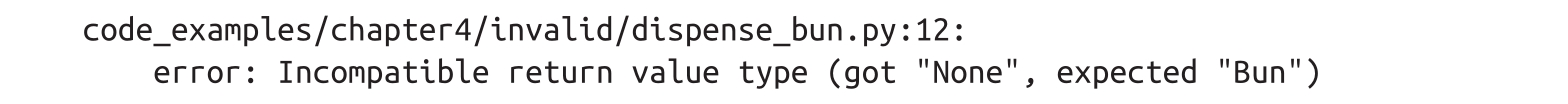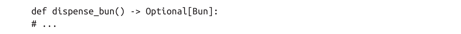 完美!默认情况下,类型检查器不允许函数返回None值。通过将返回类型从Bun更改为Optional[Bun],代码将成功进行类型检查。这将给开发人员提示,他们不应在返回类型中没有编码信息的情况下返回None。可以通过捕获一个常见错误使此代码更加健壮。那么关于调用代码呢?