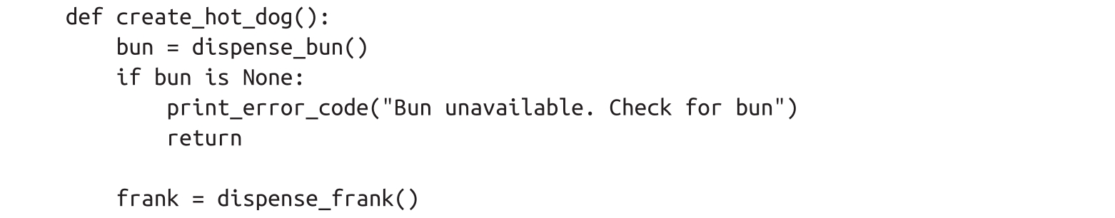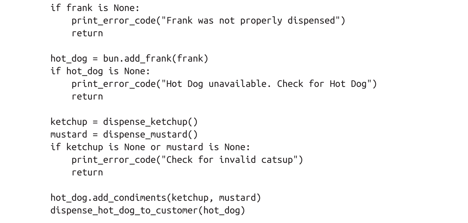 很简单对吧?可令人难受的是我们没办法保证这段代码的逻辑万无一失。当一切顺利时,通过程序的主逻辑或控制流来思考很容易,但是在谈论健壮的代码时,开发者就需要考虑错误情况了。如果这是一个没有人工干预的自动化展台,你能想到哪些可能的错误呢?