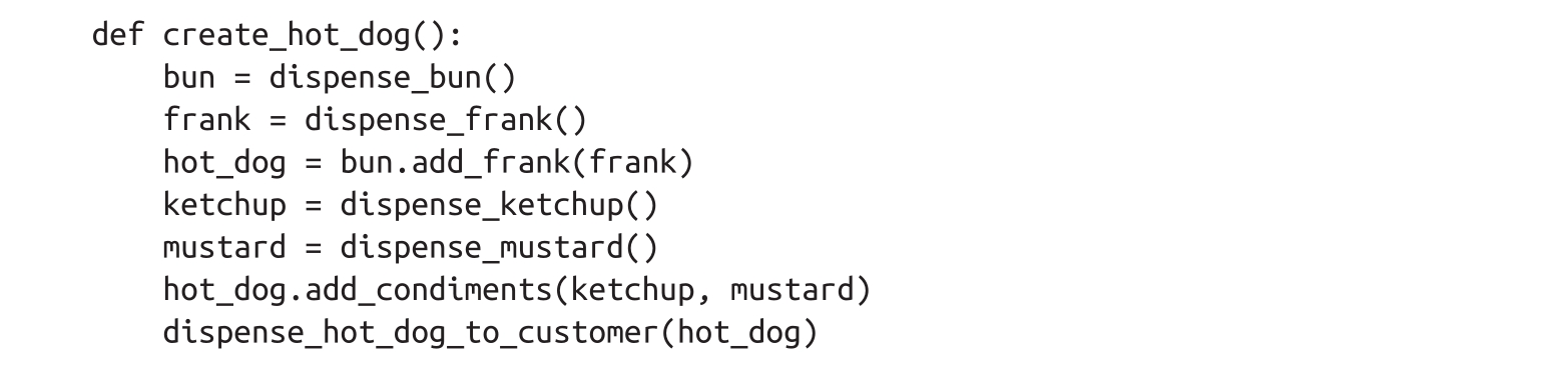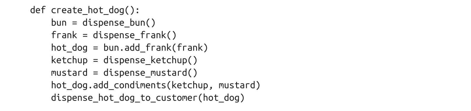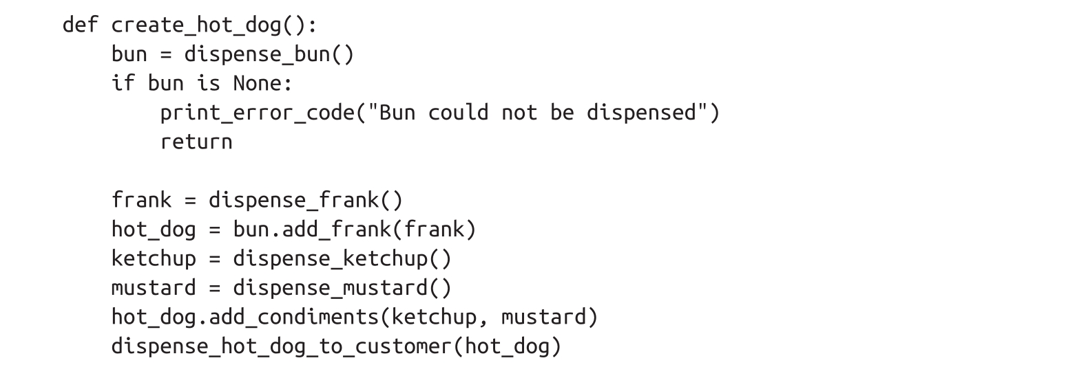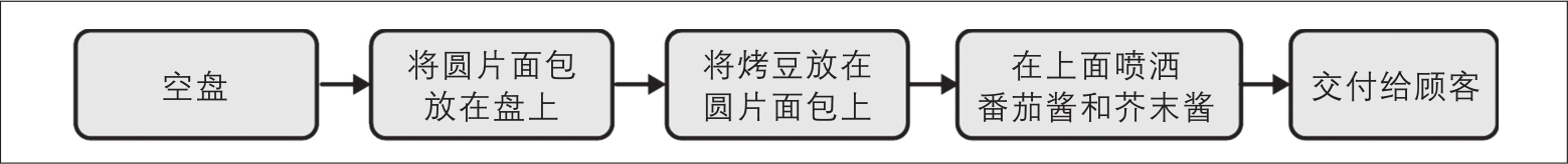 让我们一起思考下面这段关于自动热狗摊的代码的运行逻辑。首先我希望我的系统取一个小圆片面包,在小圆片面包上放入一份烤豆,然后通过自动分配器喷洒番茄酱和芥末,如图4-1所示。有哪些地方可能出错?