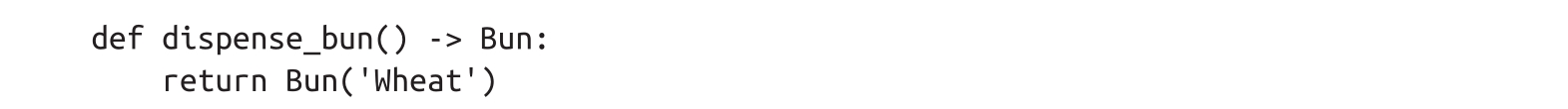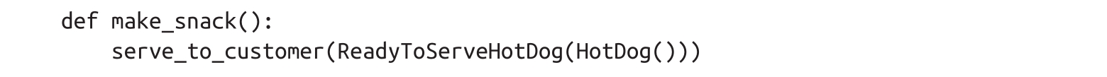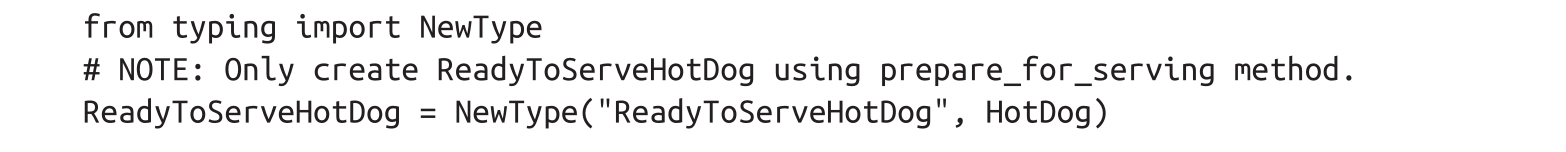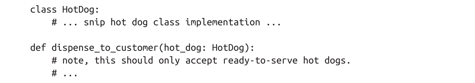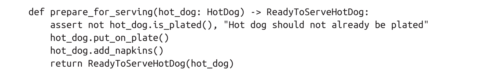注意我这里显式返回了一个ReadyToServeHotDog而不是一个普通的HotDog。这是一个“被推荐”的方法,prepare_for_serving函数是开发人员创建ReadyToServeHotDog的唯一合法方式。任何想要使用ReadyToServeHotDog对象的用户都需要先使用prepare_for_serving函数来创建它。