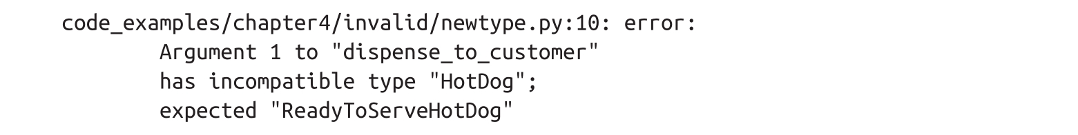 NewType可以通过现有类型创建一个全新的类型,该类型具有与现有类型相同的所有字段和方法。在本例中,我创建了一个与HotDog不同的类型ReadyToServeHotDog,它们之间不能相互置换。这个类型的精妙之处在于它限制了类型的隐式转换。开发者不能在应该使用ReadyToServeHotDog的地方使用HotDog(尽管可以用ReadyToServe HotDog代替HotDog)。在前面的例子中,我限制了dispense_to_customer只接受ReadyToServeHotDog值作为参数。这可以防止开发人员做出错误的假设。如果开发人员将HotDog类型的值传给此方法,类型检查器就会向他们报错: