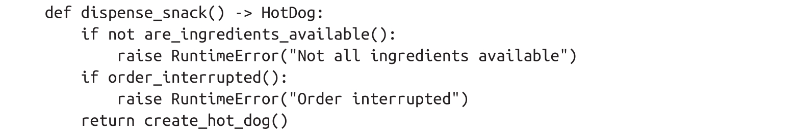 然而,我们没办法阻止开发者将无法食用的热狗作为参数传递进来。一旦开发人员这样做了,顾客会惊讶地发现他们的订单没有餐盘或餐巾纸从机器里出来。