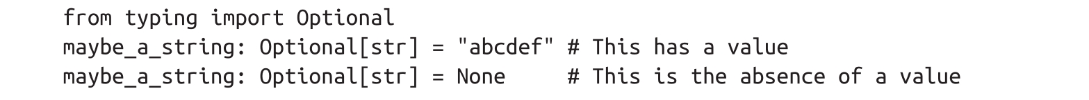 此代码表明变量maybe_a_string可以选择性地包含一个字符串。对该代码的类型检查也没有问题,无论maybe_a_string是"abcdef"还是None。