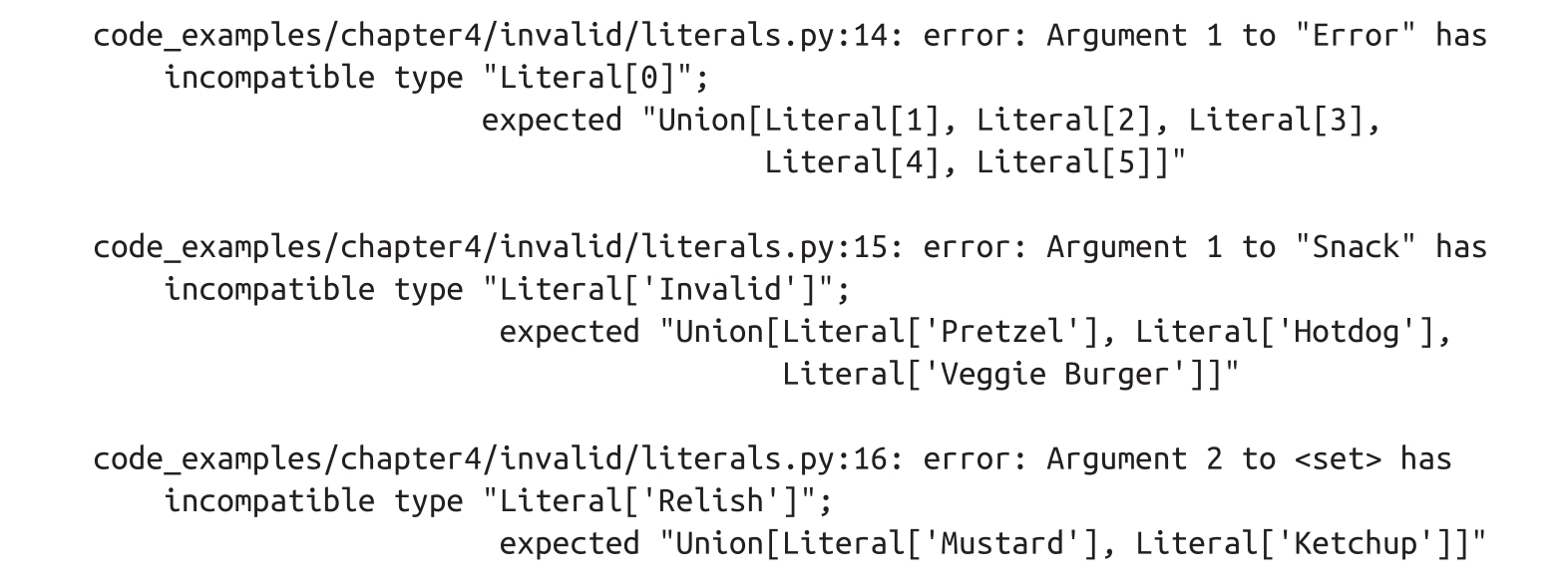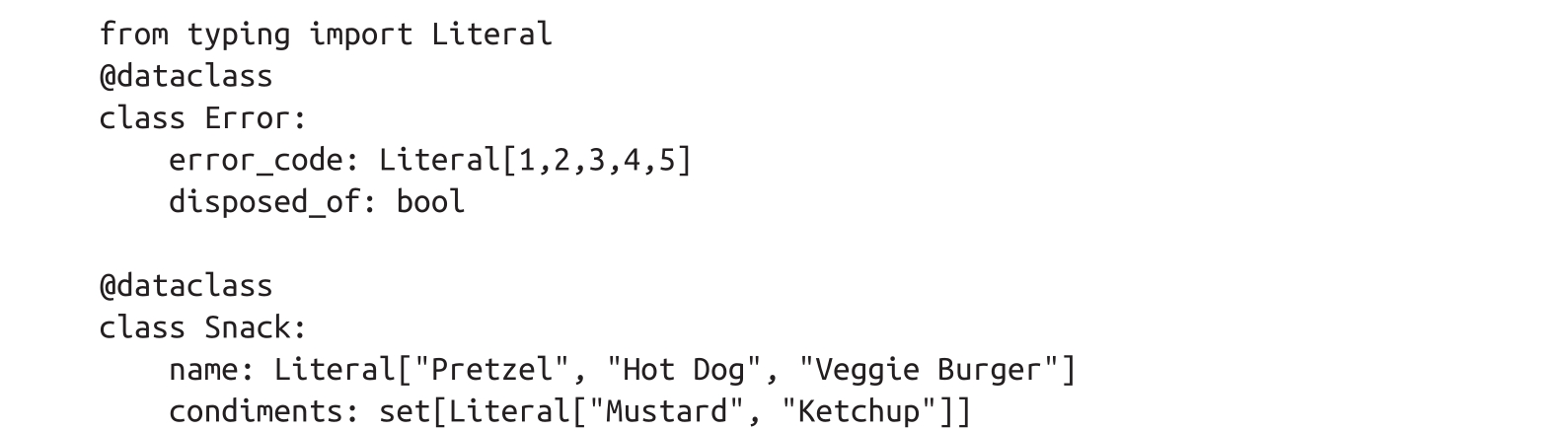 Python 3.8中引入了Literal,它是一种限制变量可能值的宝贵方法。它们比Python的枚举更轻量(我将在第8章中介绍枚举)。