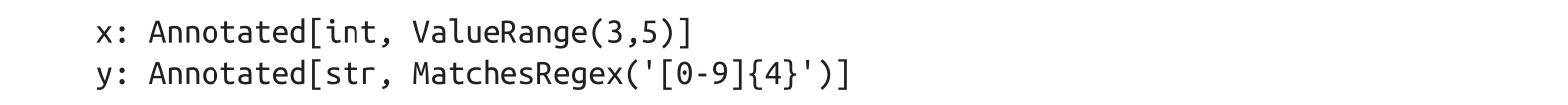 很不幸,上面的代码是不能运行的,因为ValueRange和MatchesRegex不是内置类型,它们是任意的表达式。你需要编写自己的元数据作为Annotated变量的一部分。此外,没有工具可以为你进行类型检查。在这样的工具出现之前,最好的方法就是编写虚拟注解或使用字符串来描述你的约束。从这个角度来看,将Annotated当作一种沟通方式是最恰当的。