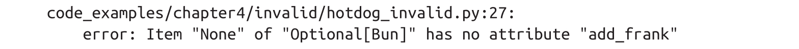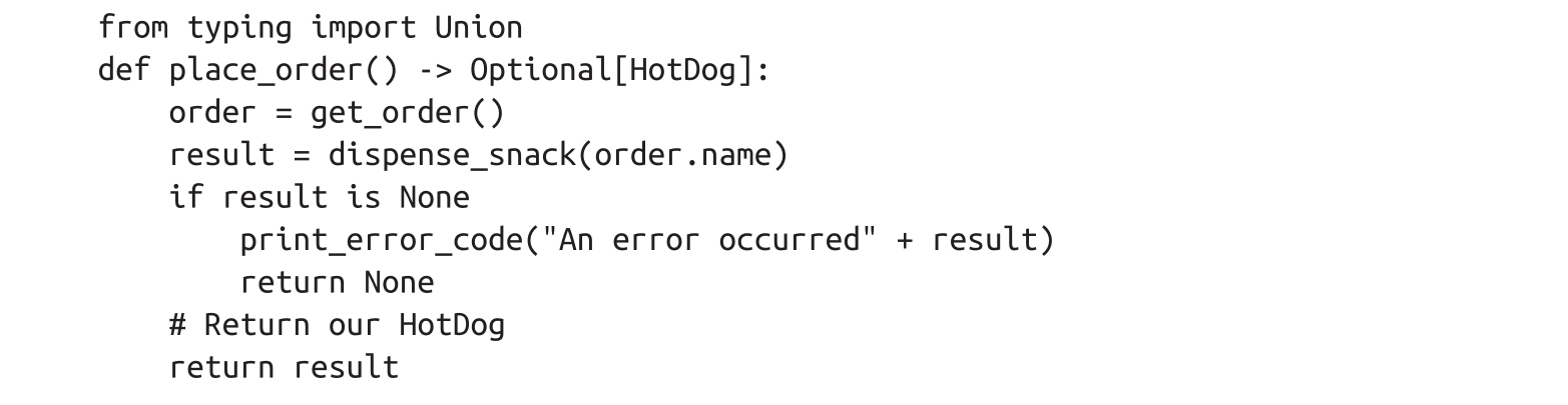 这些代码看起来非常啰唆和无聊。因为Python中的任何值都可以为None,所以似乎每一个地方都需要进行防御性编程,并在每次取消引用之前进行判空检查。这太令人难受了,大多数开发人员会跟踪调用堆栈信息并确保不会将None值返回给调用者。这使得代码在调用外部系统时必须用None检查来进行包装。这很容易出错,因为你不能假设每个接触过你的代码的开发人员本能地知道在哪里检查None。此外,开发人员在编写代码时所做的原始假设(例如,此函数永远不会返回None)在充满不确定性的将来可能会被破坏,那时代码就会出现错误。这就是我们面临的问题:仅仅依靠人工干预来捕捉错误是不可靠的。
