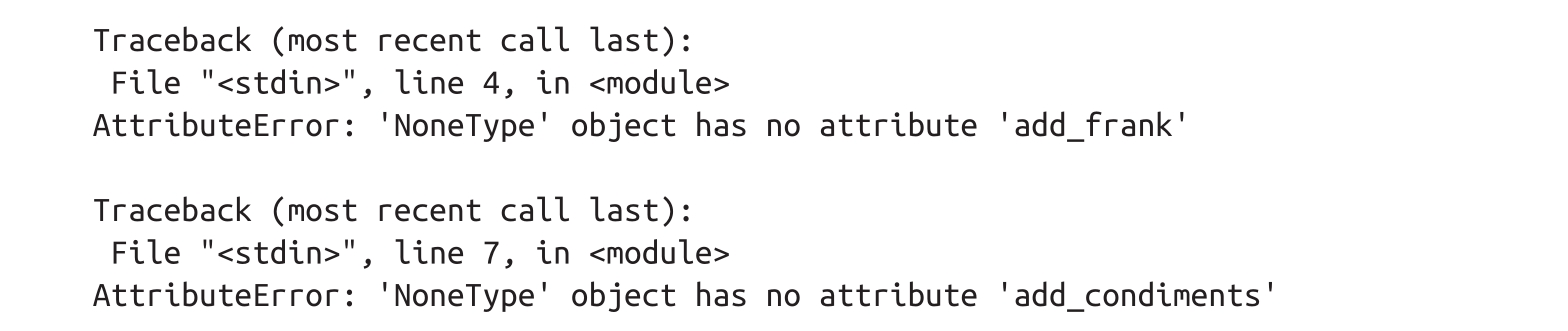 现在,假设你的系统是最先进的,可以检测所有这些信息,但它通过在失败时返回None来实现。这对这段代码意味着什么?你会看到如下错误: