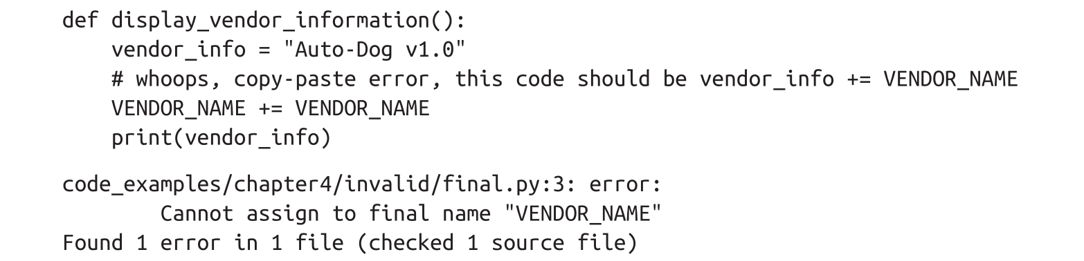 最后(一语双关),开发者也可能希望限制某个值的变更。这就是Final关键字的用武之地。Final在Python 3.8中被引入,它向类型检查器指示一个变量不能绑定到另一个值上。例如,我正准备经营我的热狗摊,但我不希望热狗摊的名称被意外更改。