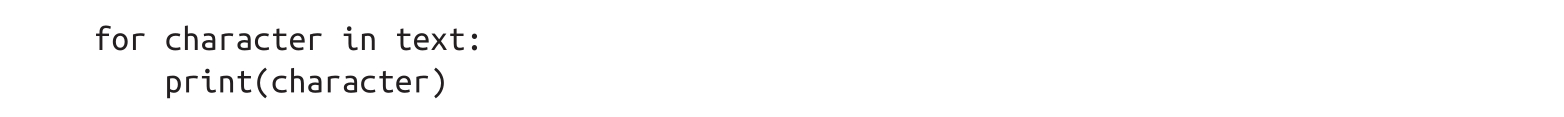 这段简单的代码将每个字符打印在单独的行中。这对于第一次使用Python尝试解决这个问题来说是完美的,但是解决方案很快就演变成更具Python风格(代码旨在强调简单性,以惯用风格编写,大多数Python开发人员都能识别):