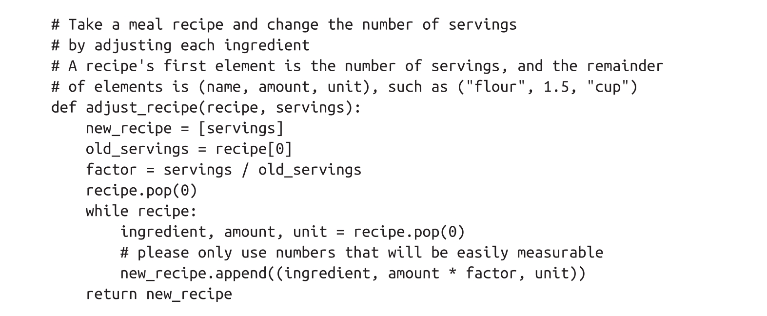 这些是否是缺陷取决于两点:原作者的意图和代码调用。作者的本意是解决问题,但我不确定他们为什么要以这种方式写代码。为什么它们会弹出元素?为什么“servings”在列表里面是一个元组?为什么要使用一个列表?根据推测,代码原作者知道原因,并将其传达给了办公室的同事。他们的同事根据这些假设写了调用代码,但随着时间的推移,原来的意图已经不清楚了。如果不能与未来的开发人员沟通,要维护这个代码就只剩下了两个选择。