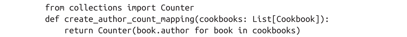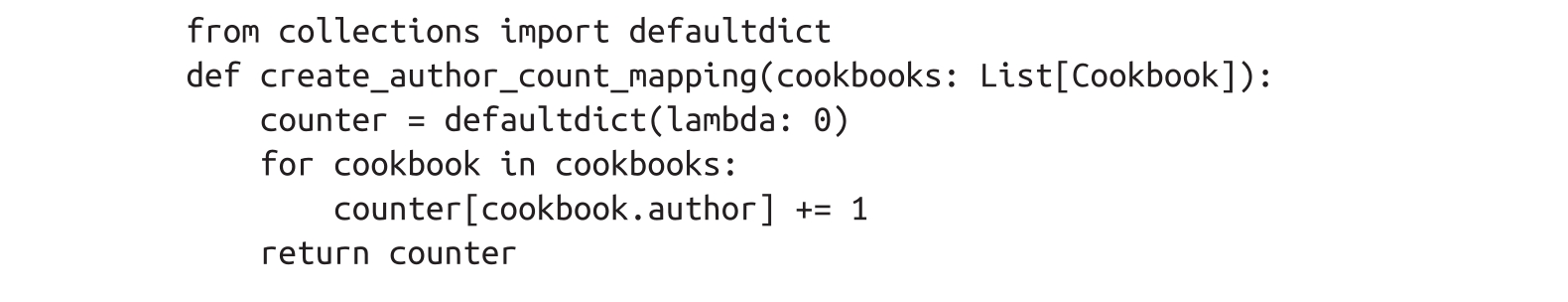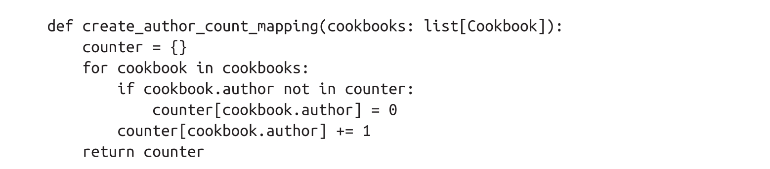 思考下面这段代码,它获取一个烹饪书列表,并提供作者与已写书籍数量之间的映射: