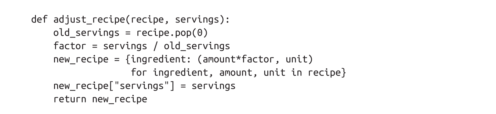 •通过返回一个字典,列表中不会再重复出现配料。这可能会对多个部分(例如主菜和酱汁)使用了相同配料的食谱产生影响。