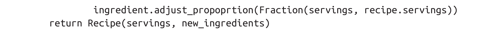 这个函数获取一个食谱,并调整每种配料以匹配新的“食用量”。但是,此代码中有许多问题: