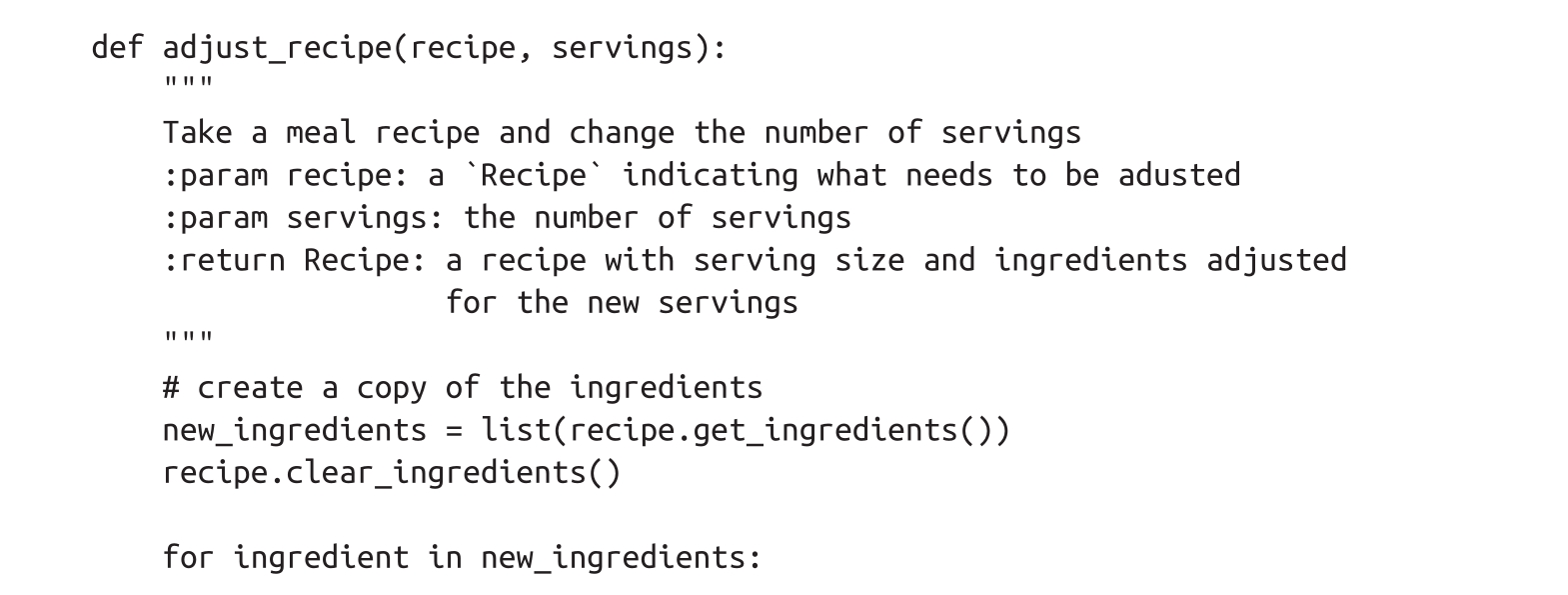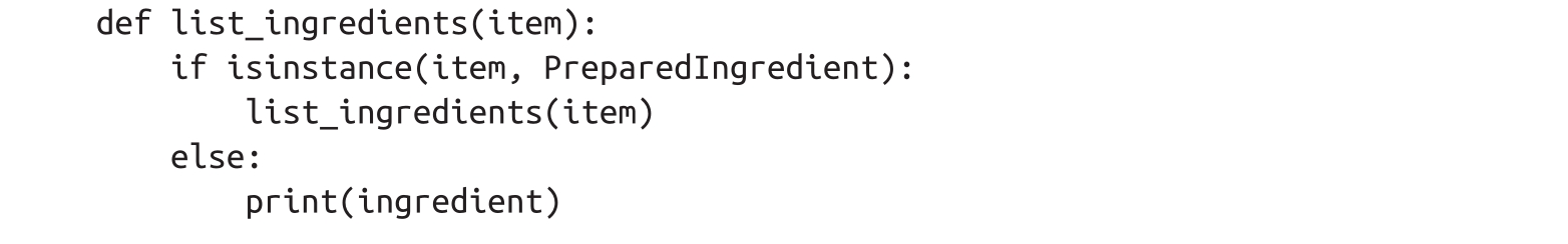 •我正在使用一个Recipe类。这使得我可以抽象出某些操作。根据推测,在这个类里面有一个不变量,允许重复的配料(我将在第10章中更多地讨论类和不变量)。这里提供了一个通用的词汇,使函数的行为更加明确。