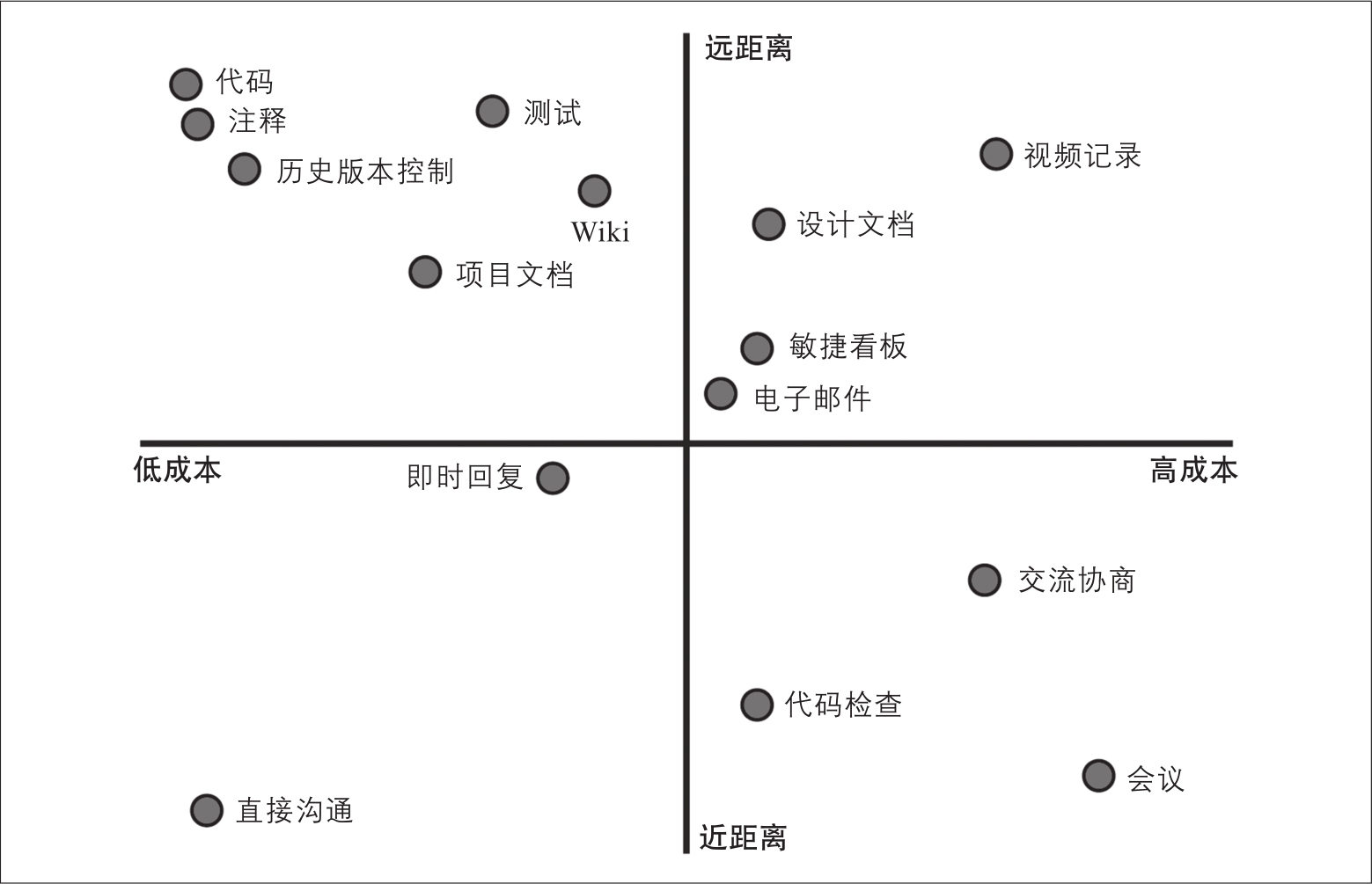 在图1-1中,我根据自己的经验绘制了一些常用的沟通方式所需的成本和距离。