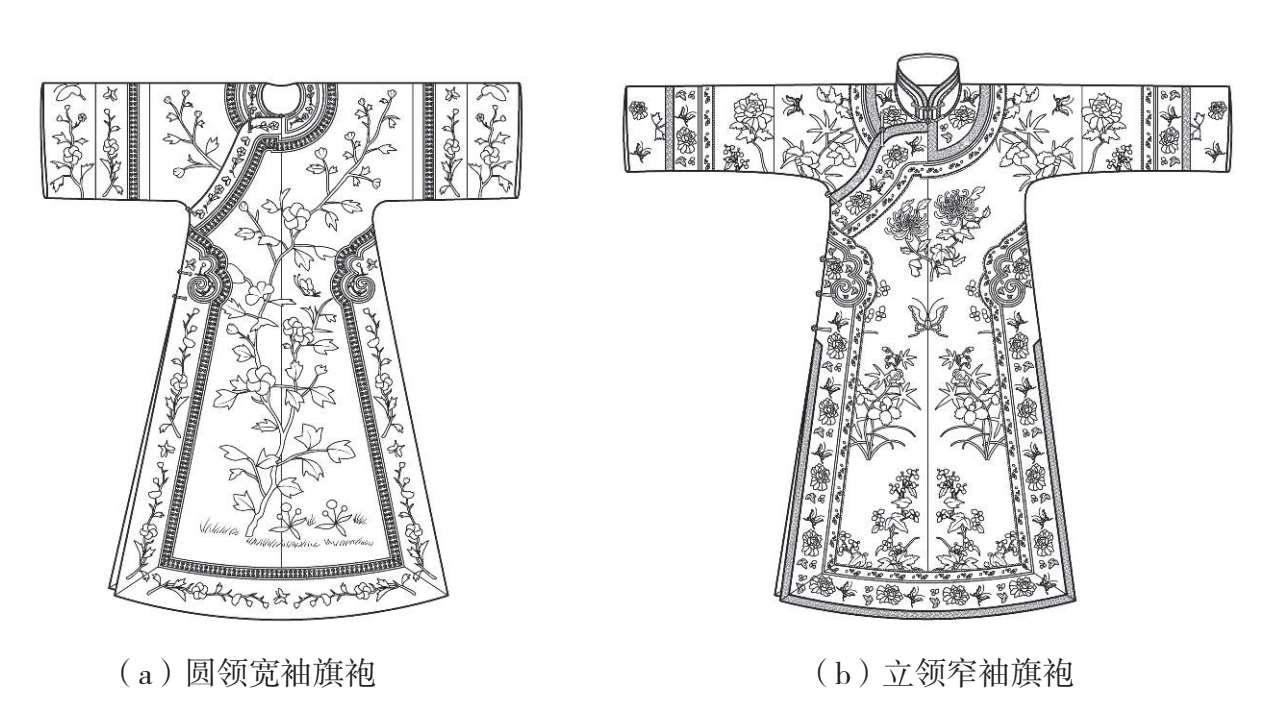 旗服原本泛指清代满族女子所穿着的服装,包括袍和衫等,后来发展演变成特指袍,俗称旗袍(图1.35)。在清代初期,满族女子旗服款式长且宽大,衣长曵地遮住双足;领口款式基本上是以无领(圆领)为主(图1.36a)。女子旗服和男子袍服在袖子处也有所不同,男子是马蹄袖,女子除了少数皇亲女眷选用马蹄袖,一般女子多数为平袖。到了清代中、后期,传统旗服款式受到汉文化的影响,开始向紧衣身、直腰型转变,领子也从原来的无领变化为立领,且领子高度慢慢增高,在清末时最高达两寸不止(图1.36b)。