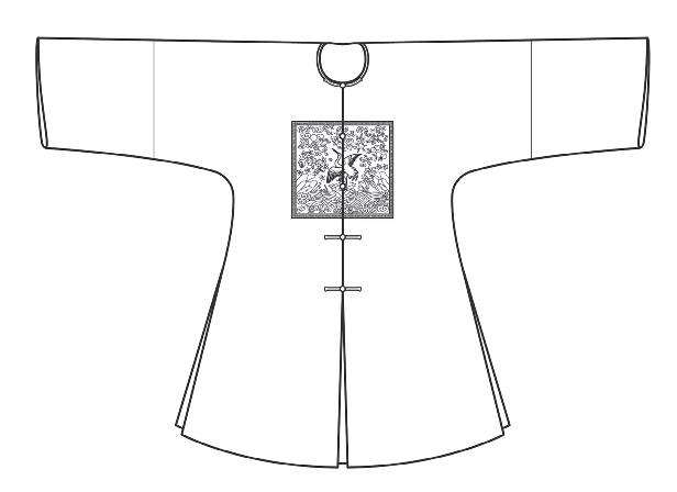 “褂”是清代特有的一种服装。“褂”的基本款式有两种:一种衣长至膝,俗称长褂。长褂中最典型的是补褂,为清代官服(图1.30和图1.31)。补褂前胸后背缝缀补子,补子图案分九品,文官为禽,武官为兽。另一种衣长仅至胯间,俗称短褂或行褂。因其穿着便于骑马,又被称为马褂(图1.32)。清早、中期长褂和马褂多为圆领,后为了装饰与保暖,便在褂内穿上“领衣”(俗称假领子)。内穿长袍,外套马褂,露出另色的“领衣”,成为清代男子官场中一种独特的穿着打扮(图1.33)。
