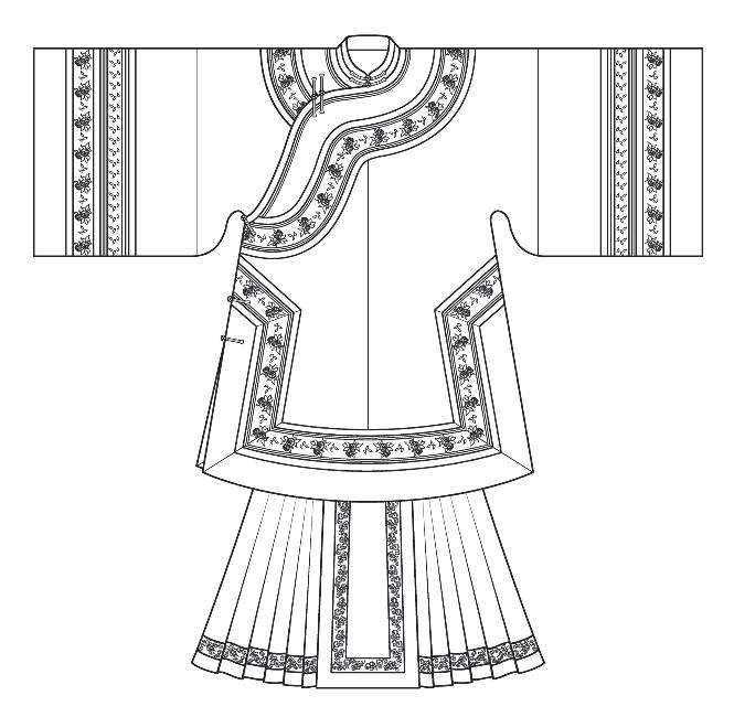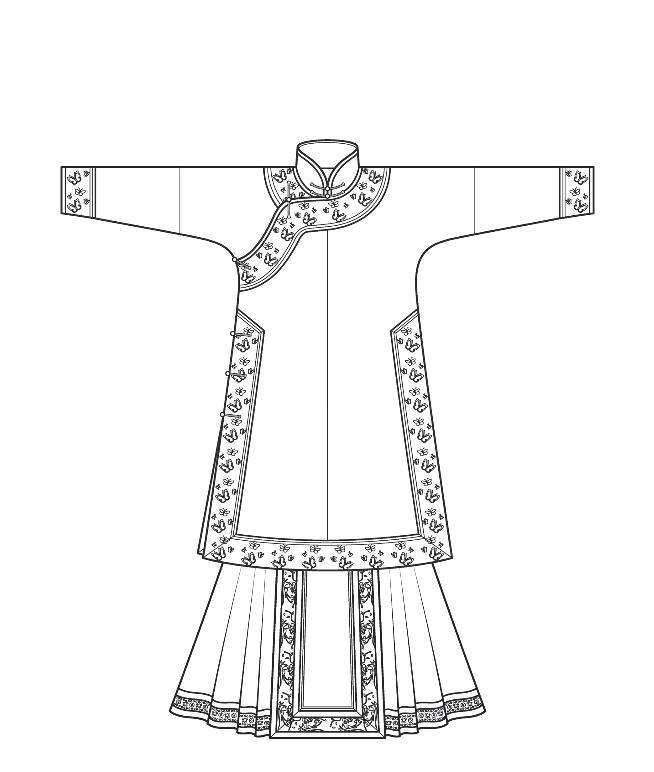 袄是从短襦演变而来的一种服装,其款式一般是大襟、窄袖,有夹袄、棉袄、皮袄等之分。清初时期,女袄一般做得比较紧身短小,穿着时衬在大袖衣衫内;清晚期则开始出现一种衣长过膝的长袄,用作外衣穿着(图1.39和图1.40)。