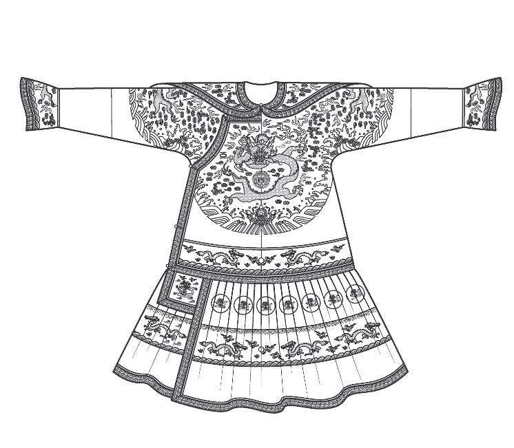“袍”中的至尊是龙袍,它是一种象征皇权的服装(图1.28)。款式为圆领,大襟右衽,箭袖;颜色以明黄为主,也可用金黄或杏黄等色。龙袍上绣有五爪金龙和五彩祥云,在祥云之间还分布着“十二章”纹样(图1.29)。按照清代大律,只有皇帝和皇后才可以穿龙袍。有功人员若蒙皇帝赐予龙袍,必须在穿着之前将龙爪挑去一爪,即将五爪改为四爪,经过挑去一爪后的龙袍,被称为蟒袍。