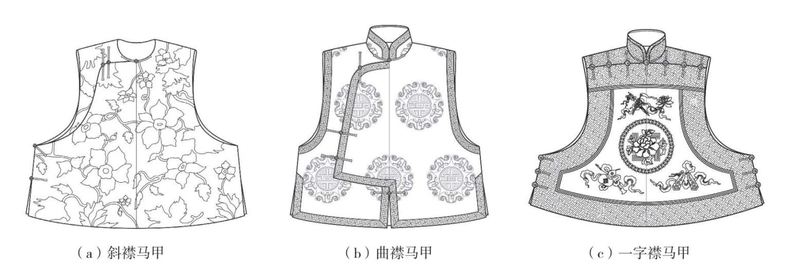 裆”式样,是清代中、后期男子日常穿着较多的一种服装。马甲俗称“背心”,北方人称其为“坎肩”,具有防寒保暖的作用。马甲在清初时期一般穿在外衣内,到了清中、晚时期演变成内衣外穿。马甲款式有多种多样,从衣襟上分,有斜襟(图1.34a)、曲襟(又称琵琶襟,图1.34b)及一字襟(图1.34c)等款式。马甲的长度通常都在腰臀之下,领型有圆领与立领。其中一字襟(一种多对纽襻)马甲为最经典的款式,满族人称其为“巴图鲁坎肩”(“巴图鲁”为满语“勇士”之意)。“巴图鲁坎肩”多用厚实的布帛缝制,中间夹层衲棉絮,也有缀以皮里,衣片分前胸、后背两片,衣襟横开在前片胸前,上面钉盘扣七对,左右两腋各钉盘扣三对,合计缝钉盘扣十三对,因此一字襟“巴图鲁坎肩”又被称为“十三太保”。这种马甲最初为武士骑马所着,穿着在袍衫之内,用作御寒之衣。如果觉得身热,则可以从外衣领襟处随手伸进里面,将盘扣解开,马甲即可脱下,不需要再解开和脱下外衣。后来这种马甲流行到民间,大受普通百姓欢迎,后从普通内衣演变发展成为日常外衣。
