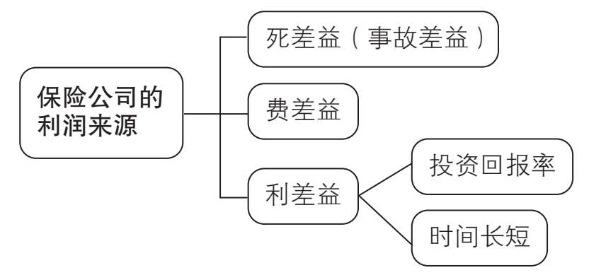 保险公司的利润来源有三种。第一是死差益。在给保险产品定价的时候,精算师会预估一个未来被保险人的死亡概率,并根据这个概率给保险产品确定价格。如果实际发生的死亡率低于预估的死亡率,保险公司赔付的钱就比预期的少,自然就能赚钱。“死差益”是保险行业通常的说法,而我们认为更准确的说法应该是“事故差益”,即只要实际出现的保险事故比预估的保险事故少,保险公司就能获得利润。