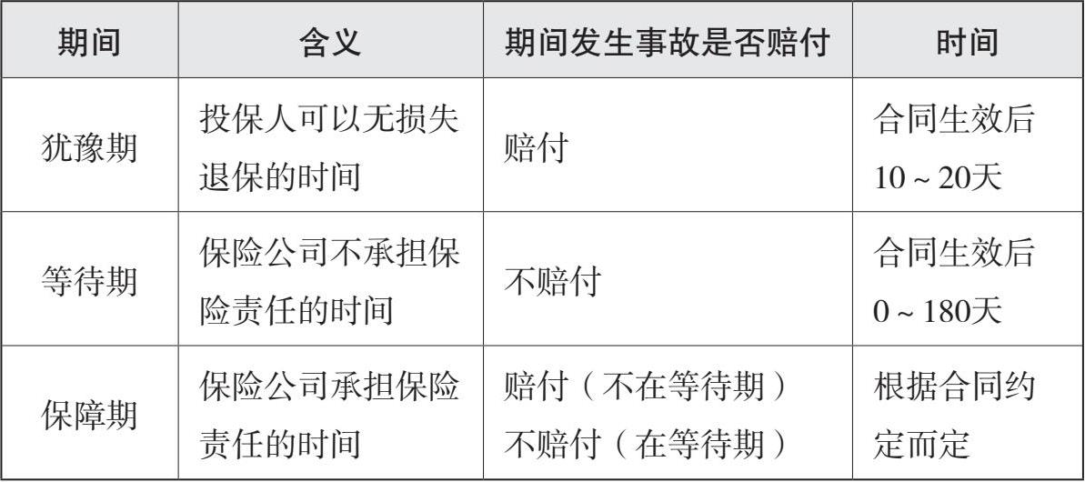 正常情况下,一份保险合同生效后,会有三个“期间”需要消费者特别注意,分别是犹豫期、等待期、保障期。这一节,我们就来详细了解这三个“期间”。