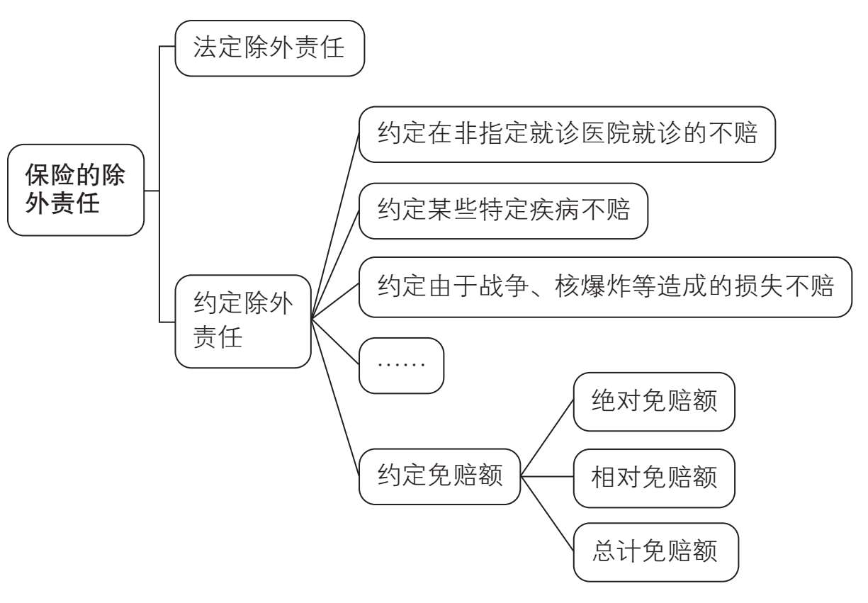 另一种是约定除外责任。这类除外责任只有在保险合同中明确约定了,保险公司才可以不赔,比如前面讲的免赔额,就属于约定除外责任的一种。投保重疾险时,如果已经得了某种疾病,保险公司会要求将这种疾病及其相关联的疾病作为除外责任。此外,战争、核爆炸等造成的损失,也是常见的约定除外责任。在医疗险中,通常保险合同中还会对就诊医院进行限制,在合同约定之外的医院就诊不予理赔,这也属于约定除外责任。之所以要指定医院,是为了排除某些不正规医院联合被保险人恶意骗保或收费虚高的风险。
