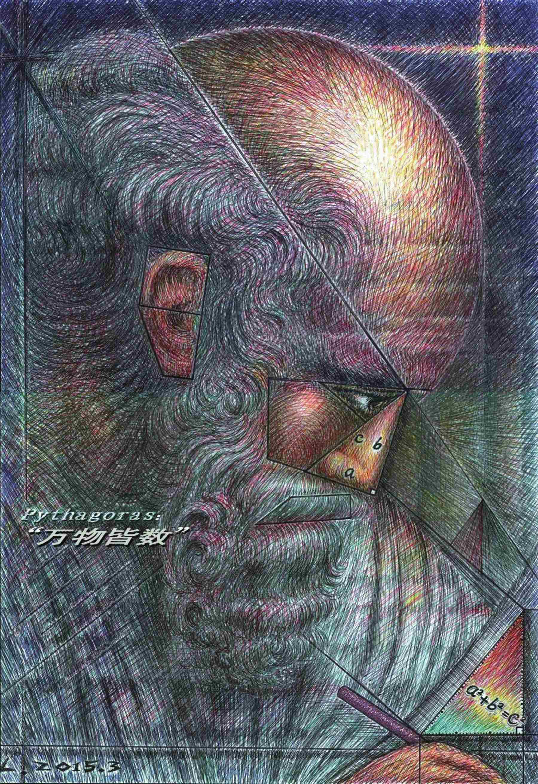 毕达哥拉斯是最早的纯粹数学家,同时又是将数学与音乐融合的人,所以,我竭力将数形结构元素融入其科学肖像的创作之中,表现数学定理图形与音乐感相结合的直观艺术形象。考虑到他讲究几何比例和音乐韵律,其科学肖像中,我让其脑、眼、鼻、耳、口等都呈现出几何图形和隐约的律动条纹,其中较为突显的鼻部呈现出一个数字直角三角形,他那聪明绝顶的脑袋更显现出智慧的光芒。他正在书写的方程式是经典的“毕达哥拉斯定理”,采用光谱色是为了更加醒目地强调数形定理的美妙。