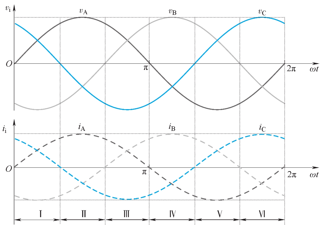 和上述单相PWM整流电路工作原理类似,三相全桥PWM整流器是通过功率器件的开通/关断来改变交流侧电流 i A 、 i B 、 i C ,改变其与电网电压的相位关系,从而达到控制功率因数角的目的。而三相电压源型PWM整流器的开关状态可由调制波来决定,从而使得输入电流按给定规律变化,具体控制方法详见本书5.1.2节。