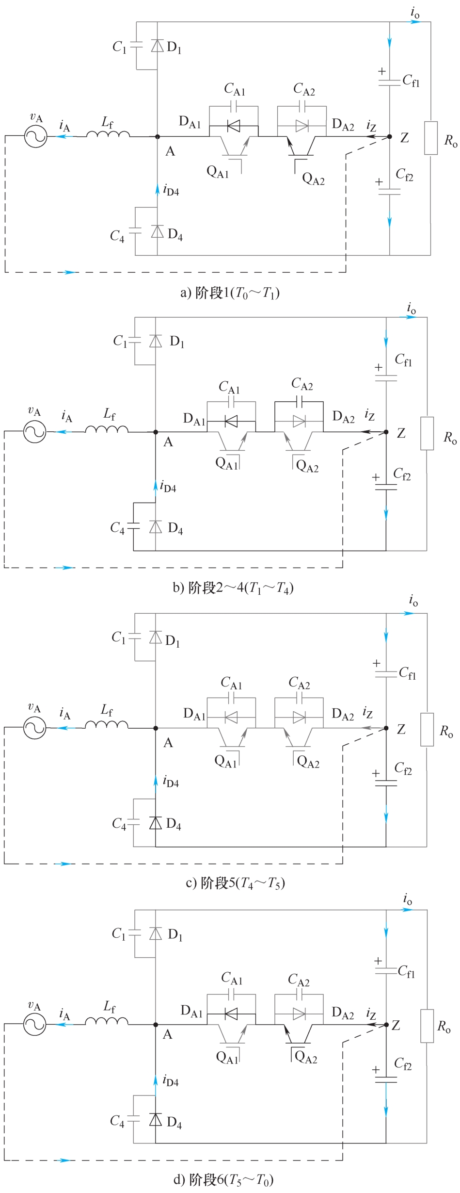 阶段6 ( T 5 ~ T 0 ): T 5 时刻,二极管D 4 关断,双向开关管Q A (Q A2 、D A1 )完全导通,重新进入下一开关周期。