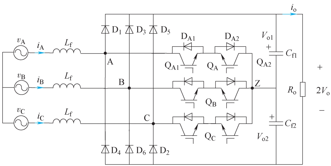 在图2.20所示的基本Vienna整流器中,主要有6个快恢复二极管(D 1 ~D 6 )、3个升压电感( L f )、3组双向开关(Q A 、Q B 、Q C )和2个输出滤波电容( C f1 、 C f2 )等构成。其中,双向开关(两个开关管共发射极串接而成)连接二极管桥臂中点和电容桥臂中点。