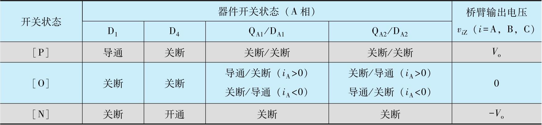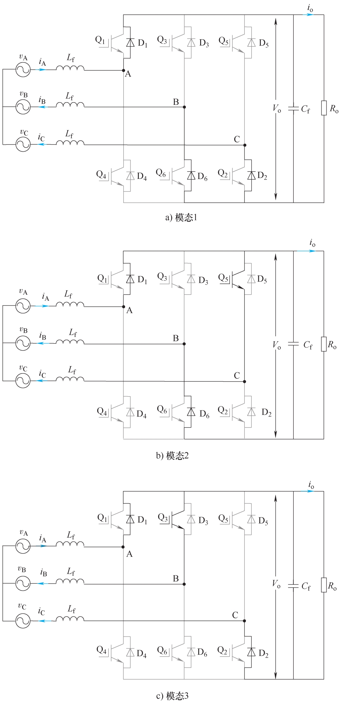 从表2.3可以看出,二极管D 1 、D 4 和Q A 运行在互补模式,即一个开关导通,另两个必须关断。同样地,B、C桥臂也运行在互补模式。