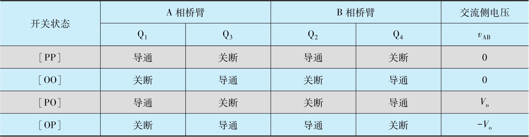 单相全桥PWM整流器的开关工作状态也称为“开关状态”,假定开关状态[P]表示整流器一个桥臂的上管导通;开关状态[O]表示桥臂的下管导通。考虑到桥臂中两个开关管不能同时导通,可得单相全桥PWM整流器共有4种开关状态组合,见表2.1。当开关状态不同时,交流侧电压 v AB 存在 V o 、0、 -V o 3种电平。