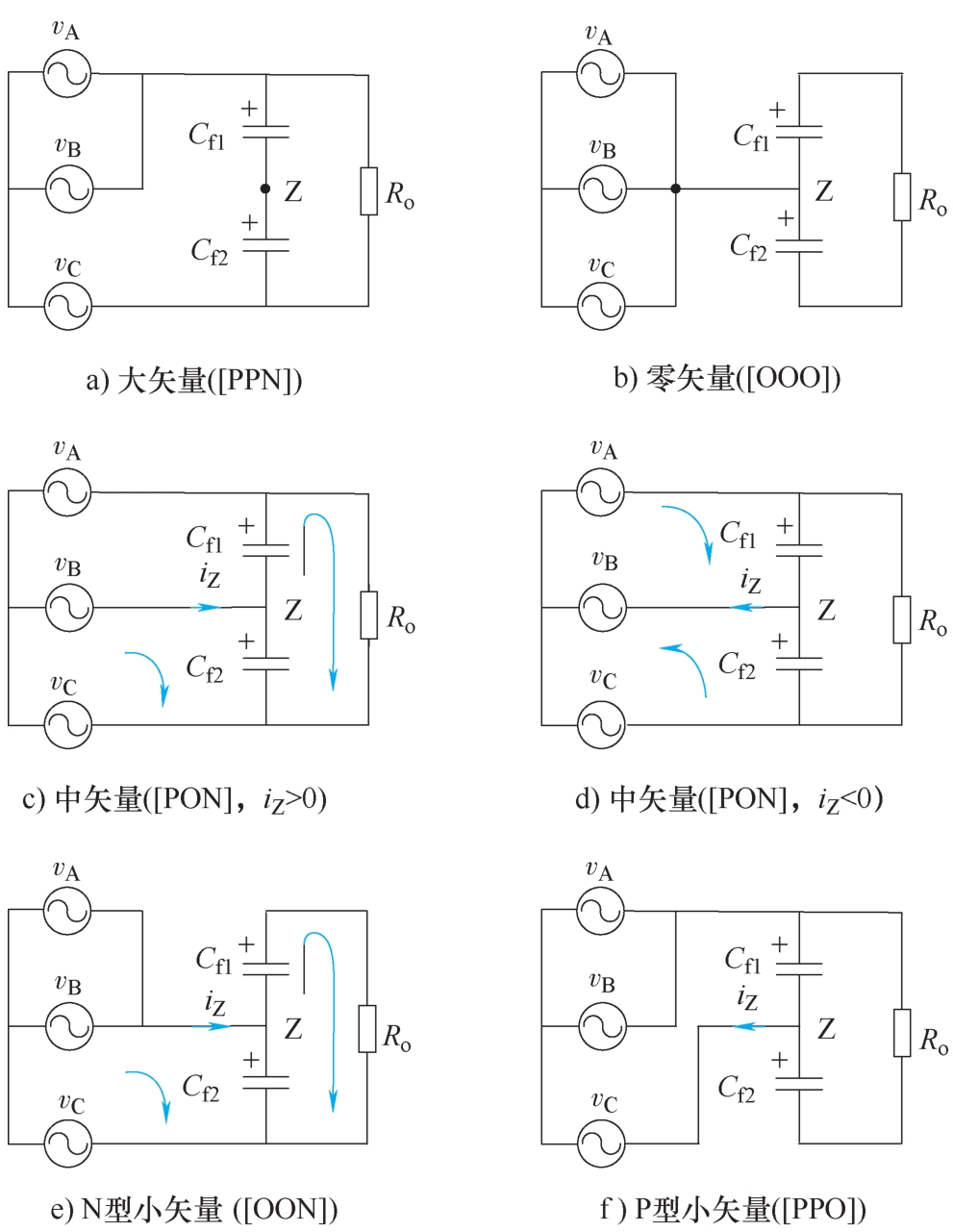 (4)对于小矢量,是成对出现,[PPO]和[OON]分别是P型和N型小矢量对应的开关状态,如图2.24e、f所示。当N型小矢量([OON])作用时,电容 C f1 放电、 C f2 充电,Δ V = V o1 -V o2 <0,导致中点电位上升;而当P型小矢量([PPO])作用时,电容 C f1 充电、 C f2 放电,Δ V = V o1 -V o2 >0,导致中点电位下降。