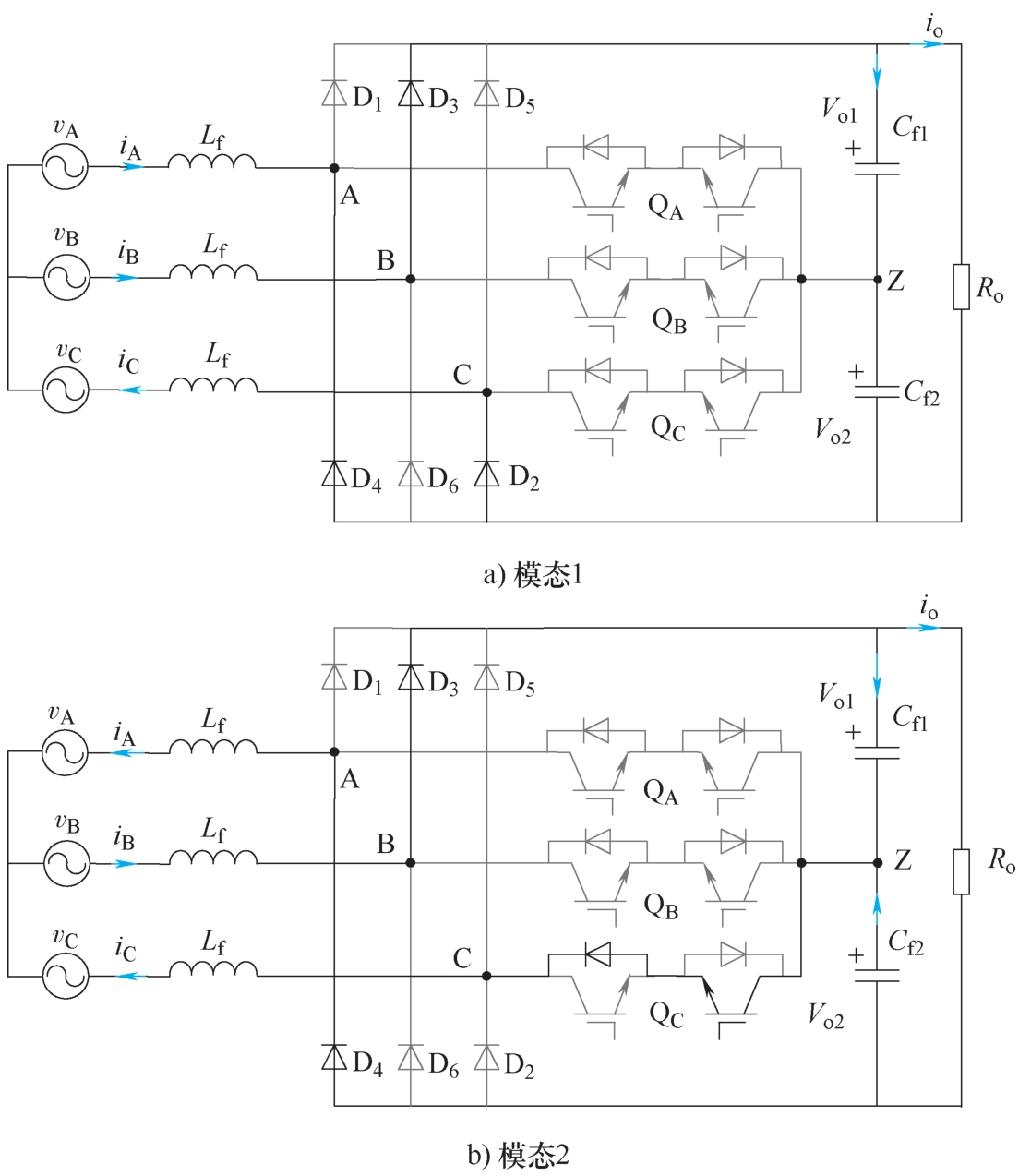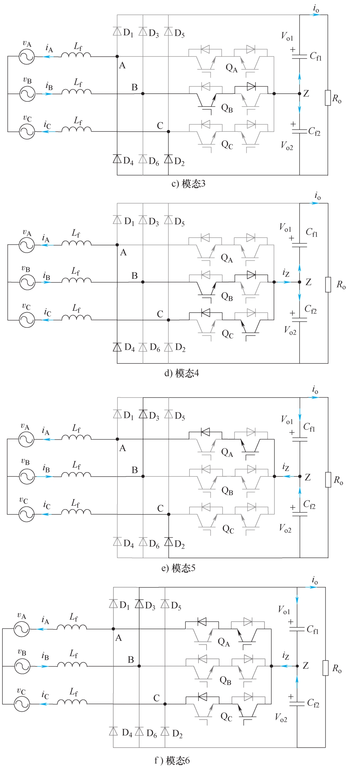 模态1 :如图2.21a所示,此模态下Q A 、Q B 、Q C 均关断,有 v AZ = -V o2 、 v BZ = V o1 、 v CZ = -V o2 。同时,电源通过电感 L f 对电容 C f1 、 C f2 同时充电,但中点电压不变;由于水平开关管均为关断, i Z =0。